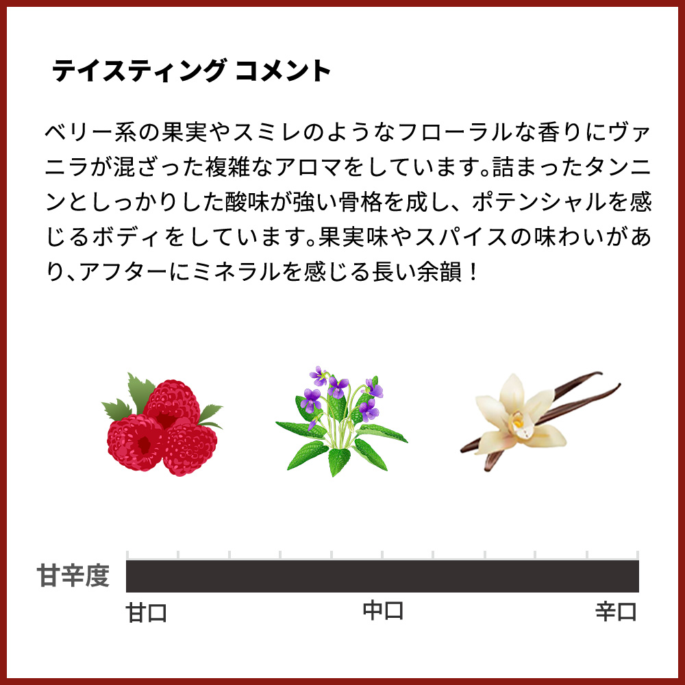 その名も“千本のバラ”という名の、スケールがありながら、きめ細やかで美しいスタイルの究極フルボディ赤ワイン!ベリー系の果実やスミレのようなフローラルな香りにヴァニラが混ざった複雑なアロマをしています。詰まったタンニンとしっかりした酸味が強い骨格を成し、ポテンシャルを感じるボディをしています。