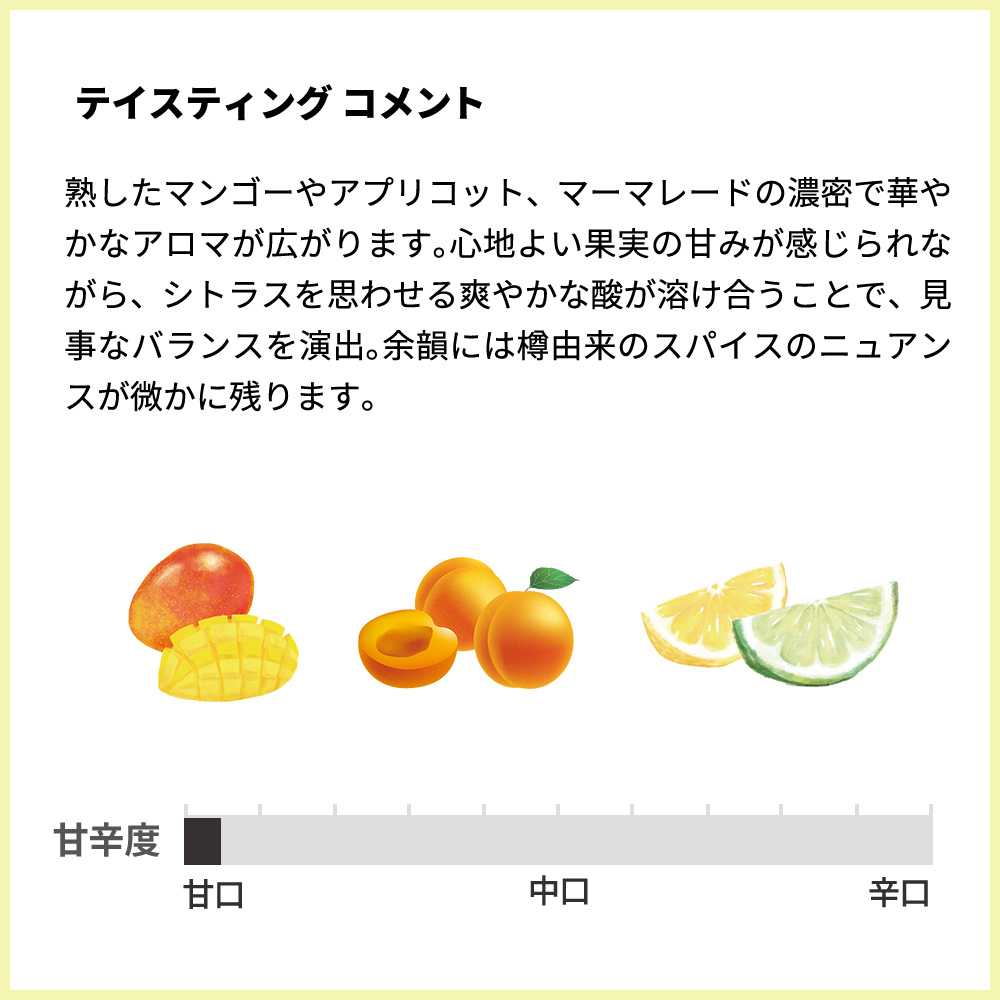 味わいはハチミツのように濃厚かつリッチで、ピュアな果実味を持ったスタイルです。外観は輝きのある黄金色。熟したマンゴーやアプリコット、マーマレードの濃密で華やかなアロマが広がります。心地よい果実の甘みが感じられながら、シトラスを思わせる爽やかな酸が溶け合うことで、見事なバランスを演出。余韻には樽由来のスパイスのニュアンスが微かに残ります。熟成によってドライフルーツやヌガー、ブラウンシュガー、クリスマススパイスなどのニュアンスも現れた、優美な仕上がりです。