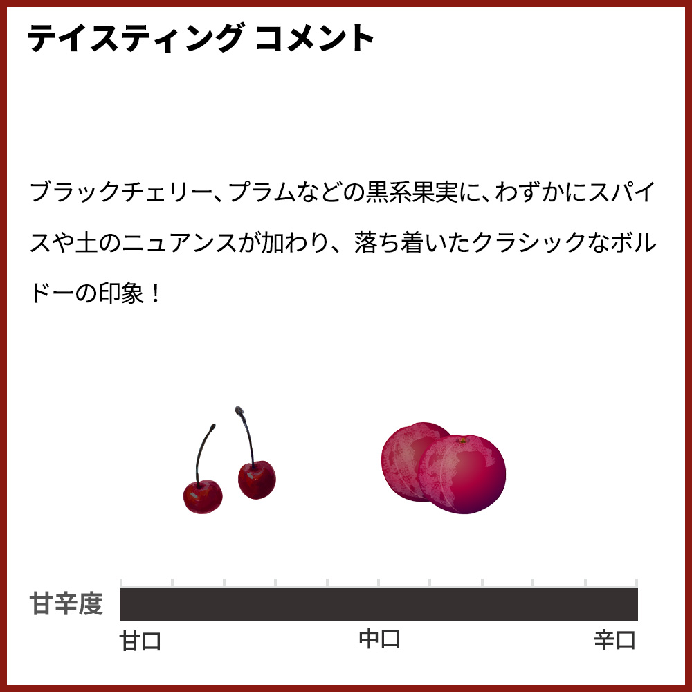 香りはブラックチェリー、プラムなどの黒系果実に、わずかにスパイスや土のニュアンスが加わり、落ち着いたクラシックなボルドーの印象!口当たりは滑らかで、果実の甘みが広がりつつも過度に重たくならず、酸とのバランスが良いため飲み心地は非常にスムーズ!コンクリートタンク熟成由来の清潔でピュアな味わいが特徴で、樽香に頼らない素直なスタイル!後味にはほのかなビター感とミネラル感が残り、食事と合わせても邪魔をしない上品な仕上がりです!