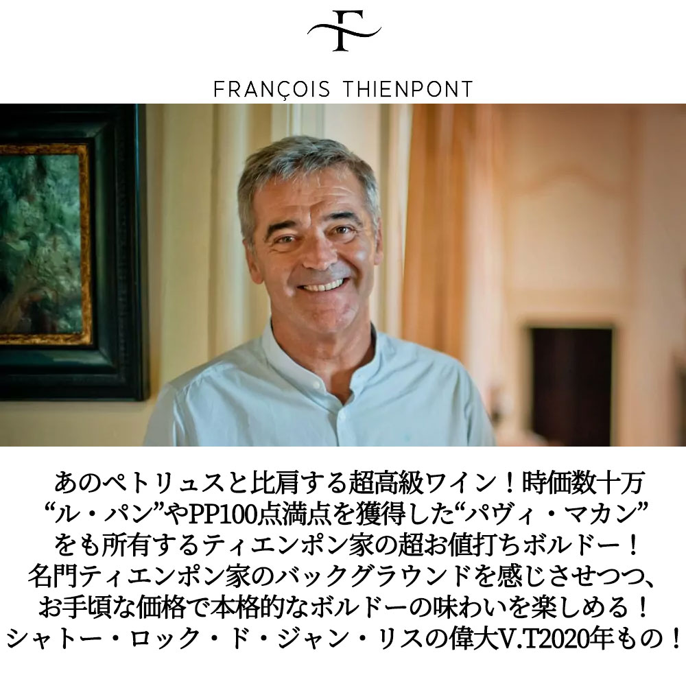 しかも時価数十万“ル・パン”やPP100点満点を獲得した“パヴィ・マカン”も所有するティエンポン家が手掛ける超お値打ちボルドー!