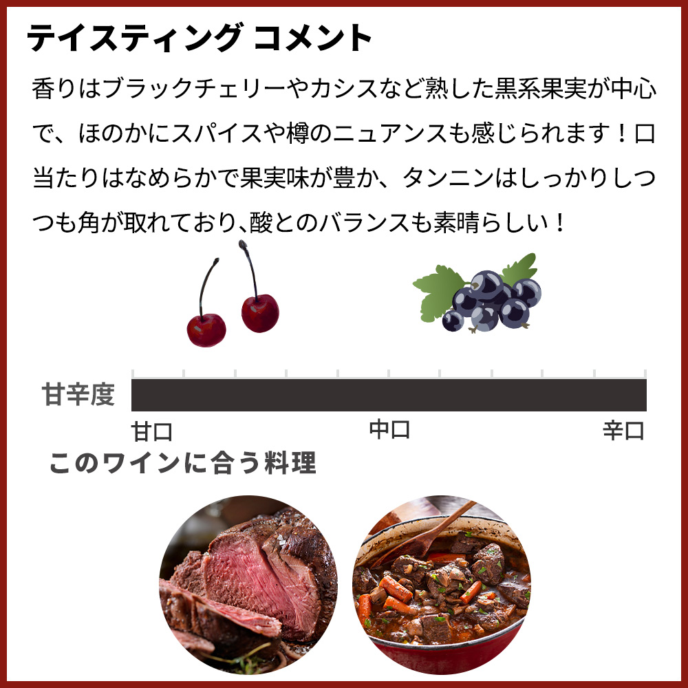 タンニンはしっかりしつつも角が取れており、酸とのバランスも素晴らしい!飲み応えがありながら親しみやすく、赤身肉や煮込み料理と相性の良い一本!
