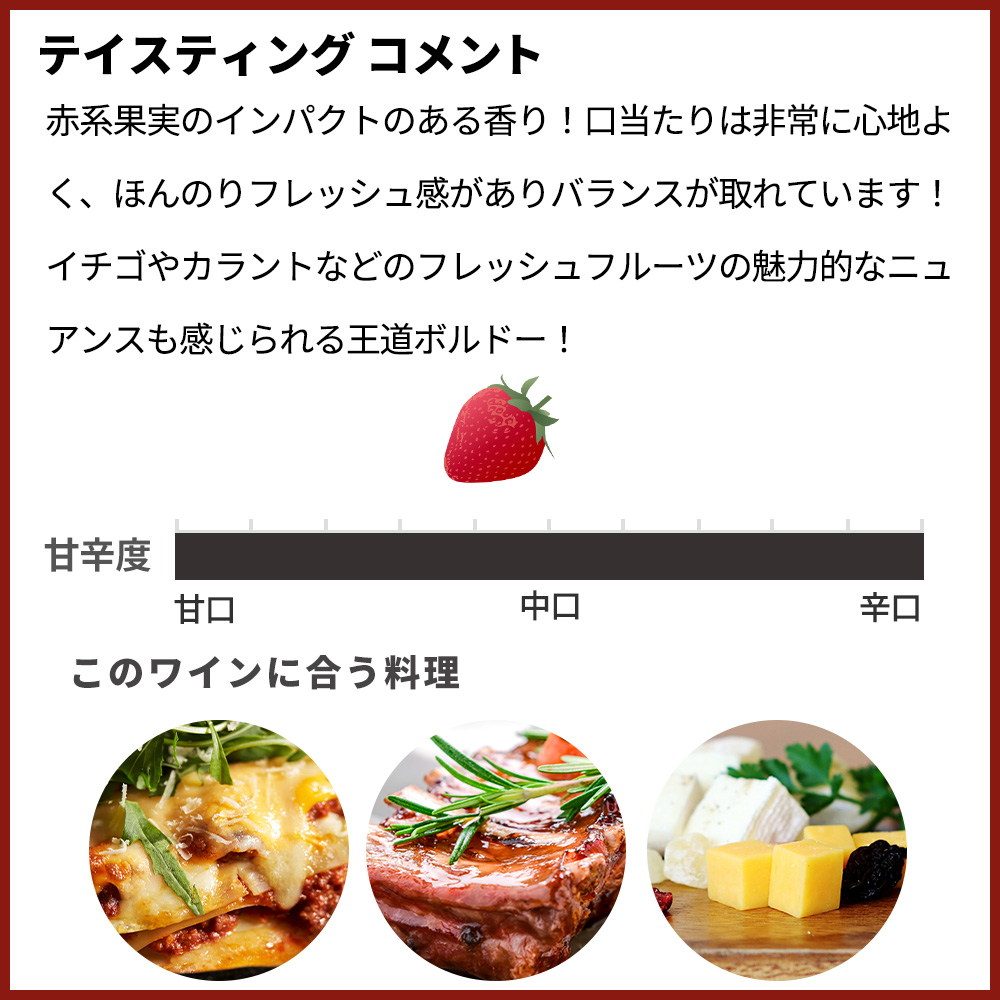 深いガーネット色!赤系果実のインパクトのある香り!口当たりは非常に心地よく、ほんのりフレッシュ感がありバランスが取れています!イチゴやカラントなどのフレッシュフルーツの魅力的なニュアンスも感じられる王道ボルドー!