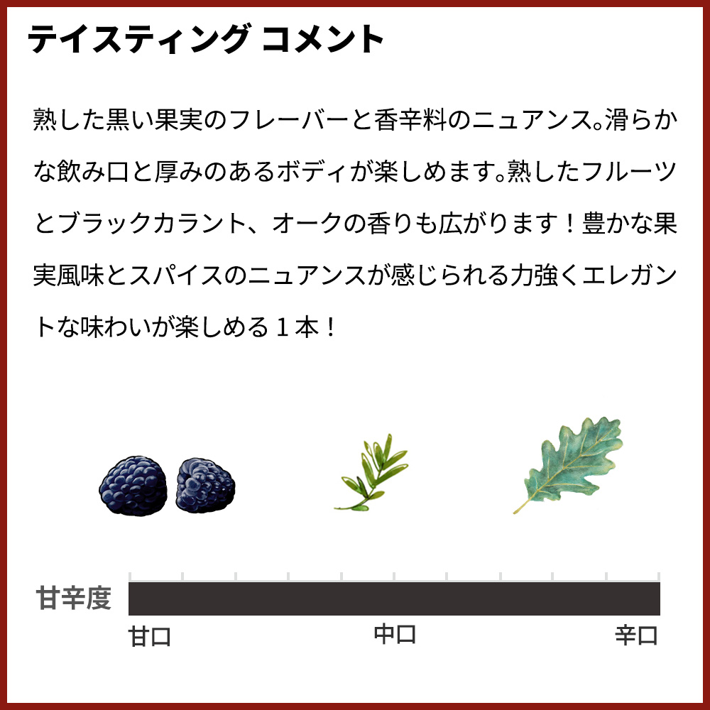 深紅色!熟した黒い果実のフレーバーと香辛料のニュアンス。滑らかな飲み口と厚みのあるボディが楽しめます。熟したフルーツとブラックカラント、オークの香りも広がります!豊かな果実風味とスパイスのニュアンスが感じられる力強くエレガントな味わいが楽しめる1本!