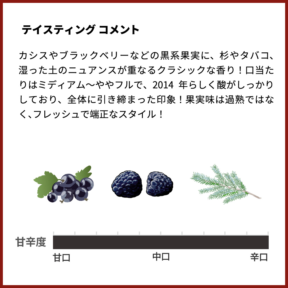 カシスやブラックベリーなどの黒系果実に、杉やタバコ、湿った土のニュアンスが重なるクラシックな香り!口当たりはミディアム~ややフルで、2014年らしく酸がしっかりしており、全体に引き締まった印象!タンニンは細かく、時間の経過とともに滑らかに変化するタイプ!果実味は過熟ではなく、フレッシュで端正なスタイル!余韻にはスモーキーさやミネラルが残り、重厚すぎずバランスの取れたエレガントな仕上がり!