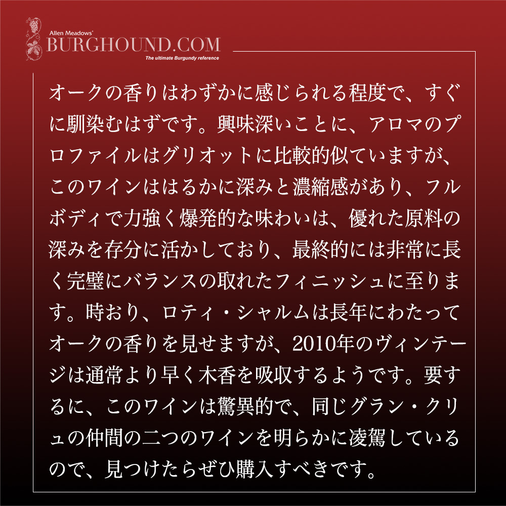 あのナポレオンが賞揚し愛した“シャンベルタン・グラン・クリュ特級”に隣接し、しかもシャンベルタン特級に比べて「タンニンも控えめでしなやかでまるみがある」と言われる究極グラン・クリュ・特級・シャルム・シャンベルタン!
