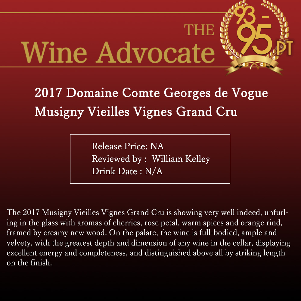 WA誌驚異の93-95点で、コメントは「2017年のミュジニー・ヴィエイユ・ヴィーニュ・グラン・クリュは実に素晴らしい出来栄えで、チェリー、バラの花びら、温かみのあるスパイス、オレンジの果皮のアロマがグラスの中で広がり、クリーミーな新樽の香りに縁取られている。口に含むと、ワインはフルボディで豊満、ヴェルヴェットのようで、セラーにあるどのワインよりも深みと奥行きがあり、素晴らしいエネルギーと完成度を示し、何よりも余韻の長さが際立っている。」