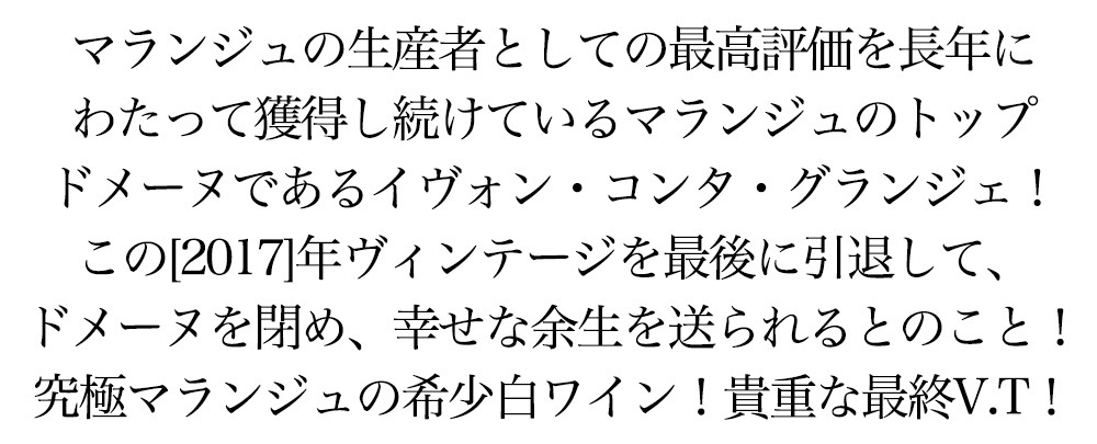マランジュ ブラン 2017年 ドメーヌ コンタ グランジェ元詰 ■葡萄品種:シャルドネ100% ■樹齢:20~70年 ■新樽率:20% ■熟成:12ヶ月間 マランジュの白はAOC全体のわずか5%(2ha)しか生産されない超希少ワイン(白ワインがアペラシオン全体の僅か5%) 白ワインは、明るい黄金色!桃やマンゴー、アプリコットなどの黄色い果実の香りに洋ナシやリンゴ等のエキゾチックなフルーツの香り! キレイな酸、豊かなミネラル感、風味豊かな素晴らしい味わい。 しかも造り手は、本国フランスで最も権威あるワインガイド「レ・メイユー・ヴァン・ド・フランス」において、マランジュの生産者としての最高評価を長年にわたって獲得し続けている、マランジュのトップドメーヌ! (「Les Meilleurs Vins de France」、「Guide Hachette」、「Guide Fleurus」、「Gault Millau」等多数注目!)