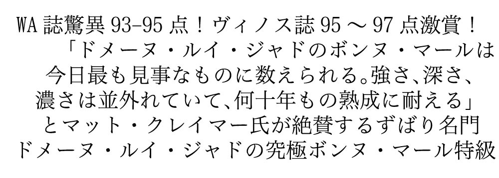 ボンヌ マール グラン クリュ 特級 2018年 ドメーヌ ルイ ジャド元詰 ■発酵:大桶で3~4週間 ■熟成:オーク樽で18~20ヶ月 ■場所:シャンボール・ミュジニー側100% WA誌驚異93-95点!ヴィノス誌95~97点激賞!「ドメーヌ・ルイ・ジャドのボンヌ・マールは今日最も見事なものに数えられる。 ヒュー・ジョンソン氏に「極めて頑固で寿命の長いワインは、シャンベルタンとも対等に勝負しうる。」と言わしめた長期熟成ボンヌ・マール特級! 強さ、深さ、濃さは並外れていて、何十年もの熟成に耐える」とマット・クレイマー氏が絶賛する、ずばり名門ドメーヌ・ルイ・ジャドの究極ボンヌ・マール特級!
