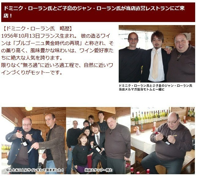 ドミニク・ローランについてロバート・パーカー氏は…ドミニク・ローランは、ブルゴーニュで最もすばらしい赤ワインを造りだしている生産者である。訓練を積んだ菓子職人であるローランは、数年という短期間で(最初のヴィンテージは1989年)ネゴシアン会社を設立したが、その目を見張るようなワインは、まだ姿をあらわさないうちに、つまり、どんな評判も出ないうちに売り切れてしまう!