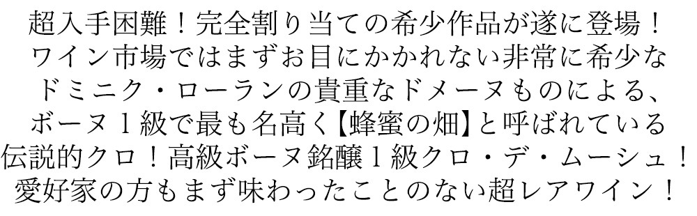 ボーヌ プルミエ クリュ 1級 クロ デ ムーシュ 2017 ワイン市場ではまずお目にかかれない非常に希少なドミニク・ローランの貴重なドメーヌものによる、ボーヌ1級で最も名高く【蜂蜜の畑】と呼ばれている伝説的クロです。 凝縮した果実味と十分な酸を持ったバランスの取れた骨格のあるヴィンテージになります。この機会にぜひ、ご賞味ください。