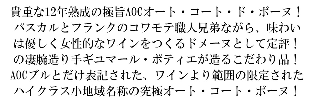 ブルゴーニュ オート コート ド ボーヌ ラ ダリニェール ルージュ 2012 ドメーヌ ギユマール ポティエ元詰 赤 辛口 750ml ■栽培:実質ビオロジーのリュット・レゾネ栽培 貴重な10年熟成のAOCオート・コート・ド・ボーヌ! コート・ドールで一番美しいロシュポーのお城が眺められる標高の高い(Haut)後背地の村から造られる、日当たりのよいACブルゴーニュとだけ表記された、ワインより範囲の限定されたハイクラスの小地域名称ワイン! AOCブルゴーニュ・オート・コート・ド・ボーヌ・ルージュ! 古くから実質ビオロジーのリュット・レゾネ栽培を実践し、醸造は長期熟成に耐える伝統的方法によるやさしく女性的なワインをつくるドメーヌとして定評!そんなドメーヌ・ギユマール・ポティエによる究極AOCオート・コート・ド・ボーヌ!もちろん蔵出し品で限定で少量入荷!