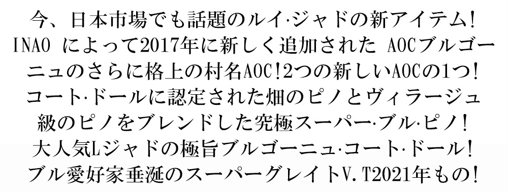 ブルゴーニュ コート ドール ピノ ノワール 2021 蔵出し品 ルイ ジャド社 AOCブルゴーニュ コート ドール 正規代理店輸入品 赤 ■ぶどう品種:ピノ・ノワール100% ■発酵・熟成:一部ステンレスタンク、一部オーク樽にて約18ヵ月間熟成 ■土壌:石灰粘土質土壌 厳選ピノ・ノワール100%を手摘み100%! 造り手は、最高水準のブルゴーニュワインの造り手として定評!ブルゴーニュの名門中の名門!パーカー氏満点5つ星★★★★★生産者であり、ゴーミヨ誌は満点5つ星!レ・メイユール・ヴァン・ド・フランス(旧クラスマン誌)5つ星生産者!1 1859年からの由緒あるブドウ栽培家としての歴史を有するジャド家のルイ・アンリ・ドゥニ・ジャドによって設立された名門中の名門、ルイ・ジャド社によるブルゴーニュ・コート・ドールに認定された畑のピノ・ノワールとヴィラージュ級のピノ・ノワールをブレンドした究極スーパー・ブルゴーニュ・ピノ!