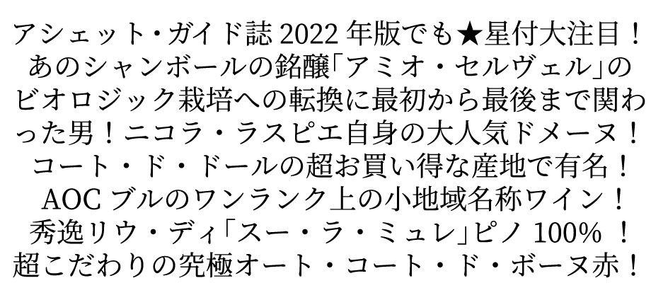 ブルゴーニュ オート コート ド ボーヌ ルージュ 2020 蔵出し品 ドメーヌ ニコラ ラスピエ元詰 自然派 ビオロジック(認証取得予定) ■ぶどう品種:ピノ・ノワール100% ■発酵・熟成:コンクリート製タンクで発酵後、樽でマロラクティック発酵&10ヶ月間熟成 ■樹齢:65年以上(1957年に植樹) ■土壌:粘土石灰質土壌 ■収量:20hl/ha ■ 葡萄園面積:0.07ha 2017年創業の期待の新進ドメーヌからなんと!わずか0.07haの自然派の極小畑からの超V.V((1957年植樹)の究極AOCオート・コート・ド・ボーヌ! 創業時より、すべての畑でビオロジック栽培を実践! ニコラの造るワインは、ライフスタイルそのものが自然派といえる彼自身の写し鏡のような、ナチュラルで癒しのあるものです。 再生紙を使用したシンプルなラベルには、趣味でハチミツを造っている彼の小さなお友達が描かれています。