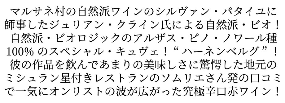 アルザス ハーネンベルグ ピノ ノワール 2021 蔵出し品 ドメーヌ ジュリアン クライン元詰 自然派 ビオロジック ヴァン ナチュール
