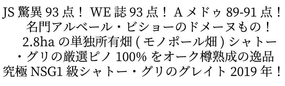 ニュイ サン ジョルジュ プルミエ クリュ 一級 シャトー グリ モノポール 2019 蔵出し限定品 シャトー グリ元詰 正規品 重厚ボトル ■ぶどう品種:ピノ・ノワール100% ■発酵・熟成:温度コントロールされたオークタンクにて3週間醗酵/オーク樽(新樽25%)で12~15ヵ月熟成 ■土壌:粘土石灰質土壌 造り手は1831年から歴史があり、6世代にわたり優れた伝統を受け継いできた家族経営の生産者! 畑は1.2kmに渡って石垣で囲われており、高度280mの急斜面にはテラス状に畑が連なっている!ずばり2.8haの単独所有畑(モノポール畑)シャトー・グリ。 美しいルビーレッドの色合い!非常に珍しいモノポール(単独所有畑)の究極ニュイ・サン・ジョルジュ・プルミエ・クリュが蔵出しで限定少量入荷!