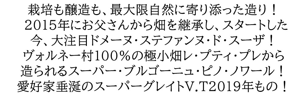 ブルゴーニュ コート ドール ルージュ レ プティ プレ 2019 ドメーヌ ステファンヌ ド スーザ元詰 AOCブルゴーニュ コート ドール ルージュ ■ぶどう品種:ピノ・ノワール100% ■収穫:手摘み100% ヴォルネー村100%の極小畑から造られるスーパー・ブルゴーニュ・ピノ・ノワール!「Bettane Desseauve」、「VertedeVin」、「Guide Hachette」等のワイン誌大注目! ヴォルネー村内の下部の便利な場所にある区画「レ・プティ・プレ」にわずかに所有する深く肥沃な粘土石灰土壌の畑からのピノ・ノワール100%を手摘み100%、天然酵母100%でオーク樽で発酵後&マロラクティック発酵後オーク樽で18ヵ月間熟成(新樽率10~15%)で造られる(清澄、および軽いろ過の後にドメーヌで瓶詰め)人気辛口赤ワイン! しかもスーパーグレイトヴィンテージでもちろん現地のセラー数か月前の蔵出し品で少量入荷!