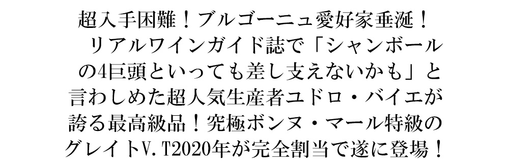 以下リアルワインガイドの抜粋 約束の地シャンボル・ミュジニーに、かくも偉大な生産者がいたことを知らなかった我々は、その耽美で不毛な時間を取り戻す術を知らない。 だから今直ぐにでも入して飲まなければならない。人生には三度の避盾がある。もし神が許すというのなら、ユドロ・バイエこそがその艶やかな 出会いのひとつとして、料那の快楽に身を任 せられることが許される唯一無二の存在と言えよう。と、どこかの誰かのように、オーバーで笑ってしまう しかない口調が思わずでてしまうほどにこの生 産者はいい。 シャンボルには3巨頭がある。ルーミエ、ヴォギュア、そしてJ・F・ミュニエだ。しかし本当に オーバーでもなんでもなく、その牙城に食い込もうとしていると断言したい。