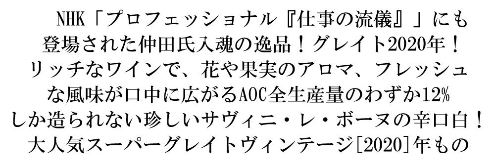 サヴィニー・レ・ボーヌ・ブラン・白[2020]年・ルー・デュモン・(仲田晃司氏) AOCサヴィニー・レ・ボーヌ ブラン 平均樹齢80年のVV フレンチオーク樽100%で16ヶ月熟成 ■発酵・熟成:16ヶ月間樽熟成 ■平均樹齢:80年 ■収量:45hl/ha 希少!ブルゴーニュ辛口白ワイン愛好家大注目!貴重なサヴィニ・レ・ボーヌの珍しい辛口白ワイン! しかも全生産量の12%しか入手できない珍しいサヴィニの白! 銘醸のシャサーニュ・モンラッシェのようなボリューム感と複雑性を兼ね備えたワインで、キレのよい酸味と生き生きとした果実味が非常に素晴しい逸品! 濃密な果実味とミネラルの塩味、そして豊かなコクが特徴!白い花と果実のアロマが特徴で、しなやかな口当たりで大人気の究極辛口白!