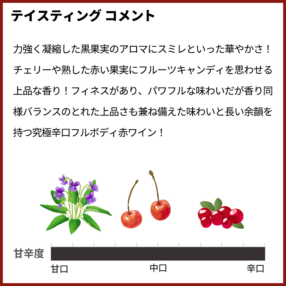 力強く凝縮した黒果実のアロマにスミレといった華やかさ!チェリーや熟した赤い果実にフルーツキャンディを思わせる上品な香り!フィネスがあり、パワフルな味わいだが香り同様バランスのとれた上品さも兼ね備えた味わいと長い余韻を持つ究極辛口フルボディ赤ワイン!