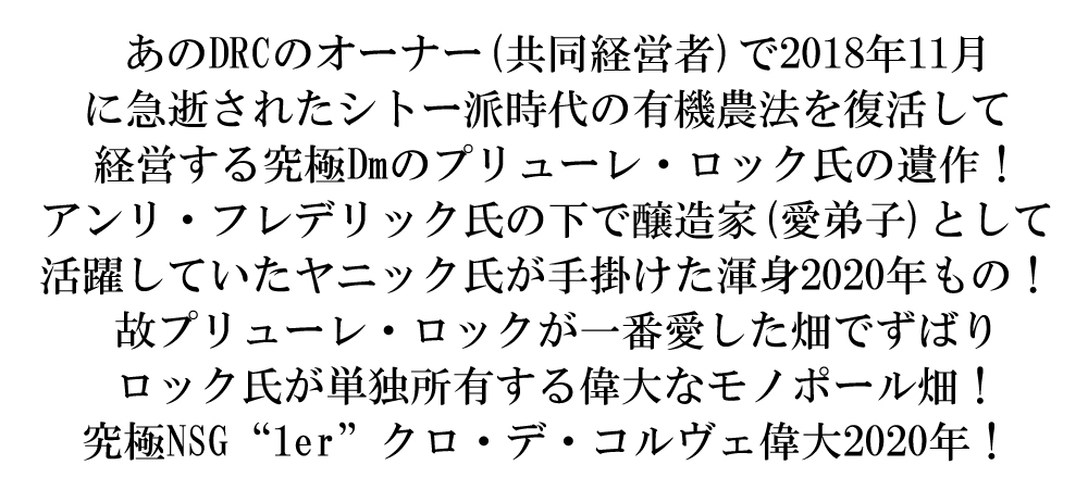 ニュイ サン ジョルジュ プルミエ クリュ 一級 クロ デ コルヴェ ヴィエイユ ヴィーニュ 2020 ドメーヌ プリューレ ロック ニュイ サン ジョルジュ 重厚ボトル ■ぶどう品種:ピノ・ノワール100% ■発酵・熟成: 樽熟成は畑の力に応じて新樽を使い分け ■平均樹齢: 55~60年以上 ■収穫:手摘み100% 超入手困難!高級辛口ブルゴーニュ赤ワイン愛好家垂涎!年産極少量!あの世界最高峰ワイン! わずか5haの銘醸畑から、樹齢に関係なく選びぬかれたミルランダージュ(結実不良。実が小さくより糖度とアロマが凝縮した果実)100%! シトー派時代の有機農法を復活して経営する究極ドメーヌ!プリューレ・ロック!手摘み100%、房をまるごと発酵槽にいれる伝統手法!樽熟成は畑の力に応じて新樽を使い分け、なんと酸化防止剤(SO2)もいっさい添加しない! ずばり、ブリューレ・ロック“貫禄の逸品”!しかもロック氏が一番愛する畑で、プリューレ・ロックが造るフラッグシップワイン「クロ・デ・コルヴェ」!