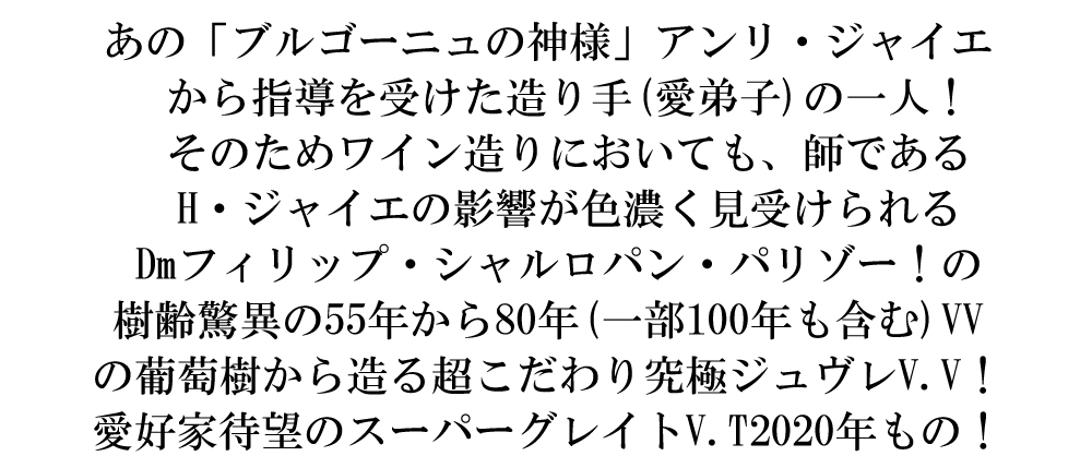 しかも9つのリュー・ディと樹齢驚異の55年から80年(一部100年も含む)のVV(ヴィエイユ・ヴィーニュ)のブドウ樹から造られるドメーヌ・フィリップ・シャルロパンのフラッグシップワイン!