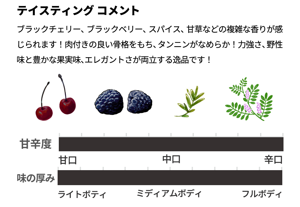 リッチで力強いミディアムボディのフレーバーには素晴らしいボリュームがあり、マイルドで素朴、適度に渋く余韻の長いフィニッシュには、苦いピットフルーツのキャラクターのタッチも感じられる、素晴らしい長さがあります。
