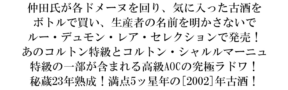 ルー・デュモン・レア・セレクションとして発売される人気のラドワ・ルージュAOC、非常に綺麗にこなれたブルゴーニュ古酒、貴重なグレイトヴィンテージ2002年秘蔵限定古酒が限定で、しかも現地のセラー数ヶ月前のセラー出しで限定少量入荷!23周年の記念ボトルに!成人を迎えられた2002年生まれの方へのプレゼントにも最適です!