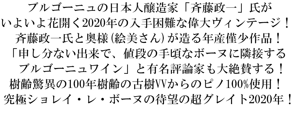 入手困難!ブルゴーニュ辛口赤ワイン愛好家大注目!ブルゴーニュ赤ワイン愛好家垂涎!今ブルゴーニュにおいて大注目の日本人醸造家、斎藤政一氏による渾身のワイン!