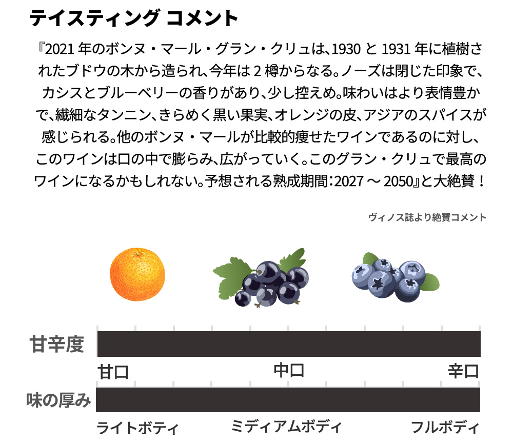 年産2樽(年産わずか600本のみ)の造り手最高峰の究極ボンヌ・マール特級!ヒュー・ジョンソン氏に「極めて頑強で寿命の長いワインは、ミュジニー特級ほどのかぐわしさはないが、シャンベルタンとも対等に勝負しうる」と高評価!