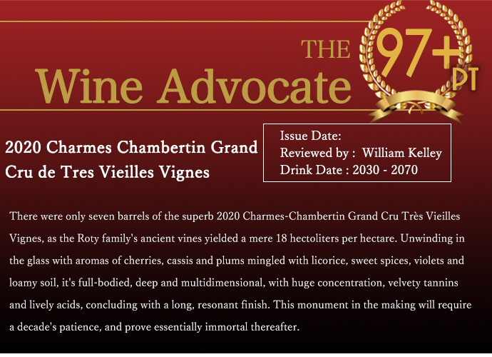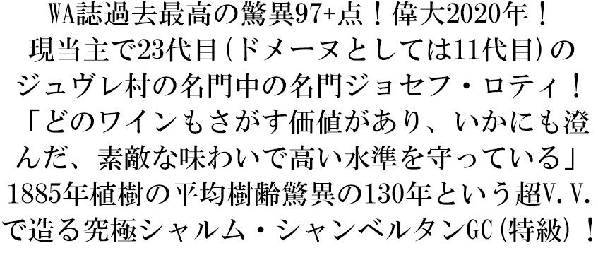 しかも飲み頃気が遠くなるような2030年~2070年までという超熟成ポテンシャル評価!グリオットの風味やスパイスの洗練された香り、凝縮感とエレガンスを合わせ持ち、しかも後味にも豊かな芳香を放つ人気フルボディ辛口赤ワイン!究極シャルム・シャンベルタン特級が蔵出しの素晴らしい状態(正規品)で限定少量入荷!