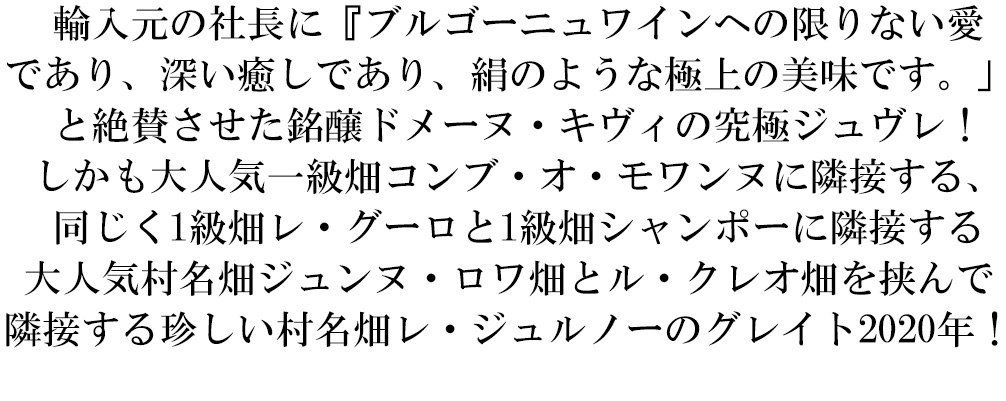 フランス・高級ブルゴーニュ辛口赤ワイン愛好家大注目!強いストラクチャーと優雅さを併せ持つ、ブルゴーニュワインの王様!ジュヴレ・シャンベルタン村!しかも人気村名畑コンブ・オ・モワンヌに隣接する、同じく一級畑Les Goulots(レ・グーロ)と一級畑Champeaux(シャンポー)に隣接する大人気村名畑ジュンヌ・ロワ畑とル・クレオ畑を挟んで隣接する珍しい村名畑のレ・ジュルノー(レ・ジョルノ)畑!