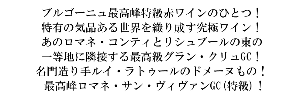 あの偉大なるロマネ・コンティとリシュブール特級の東の一等地に隣接する、最高級グラン・クリュ!しかも繊細さの極みともいうべき風味の中に、大地からくるミネラルやハーブを思わせるようなニュアンス!