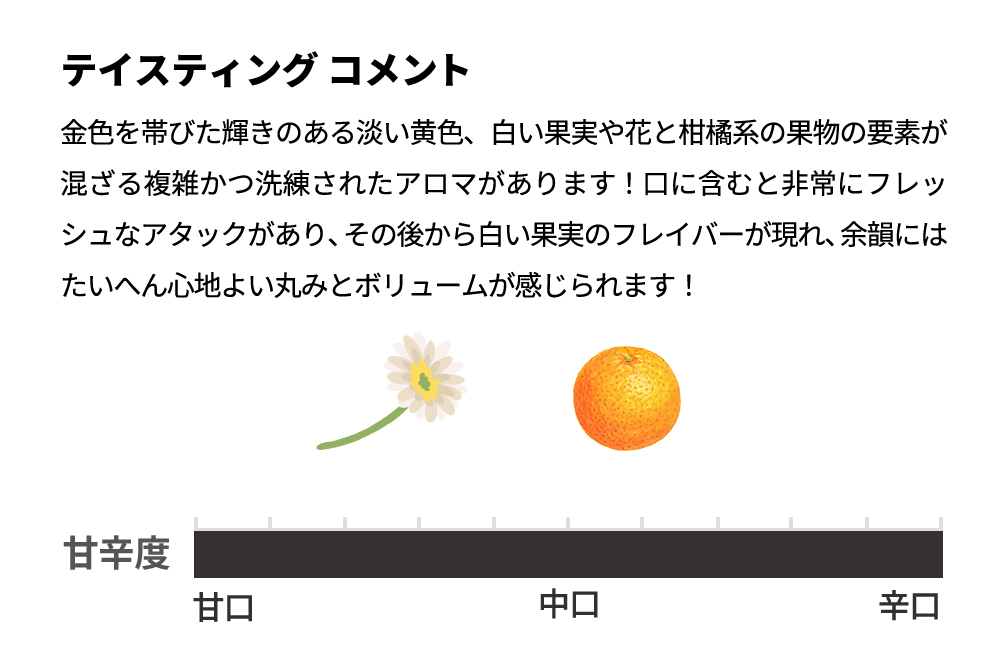 口に含むと非常にフレッシュなアタックがあり、その後から白い果実のフレイバーが現れ、余韻にはたいへん心地よい丸みとボリュームが感じられます!