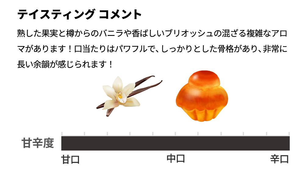熟した果実と樽からのバニラや香ばしいブリオッシュの混ざる複雑なアロマがあります!口当たりはパワフルで、しっかりとした骨格があり、非常に長い余韻が感じられます!