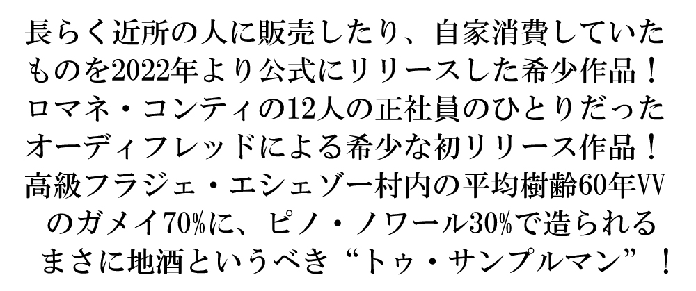 入手困難!高級ブルゴーニュ辛口赤ワイン愛好家垂涎!世界最高峰!あのロマネ・コンティ(DRC)の12人の正社員のひとりだったアンリ・オーディフレッドによる高級フラジェ・エシェゾー村内の葡萄から造られた初リリース作品!(長らく近所の人にのみ販売したり自家消費していたものを、グレイトの2022年ヴィンテージより公式にリリースしたワインがこれ!)造り手は、あのロマネ・コンティ(DRC)の12人の正社員のひとりだったアンリ・オーディフレッド!オーディフレッドのワインは総じて淡い色合いで、ピュアで繊細な果実味が口の中に優しく広がります!それでいて、大地の滋養を感じるたっぷりとしたエキスのうまみをご堪能いただけます!過去、リアルワインガイド誌18号では「極めて正しいメンタリティを持った誠実な生産者が造る優しさと奥深さに満ちたハイクオリティなワイン」として特集記事!同誌22号では「各キュヴェとも生産本数は極めて少ない。人気アイテムの入手は容易ではないと思う。ゲットできる幸運を祈るしかないと思う」と大注目させたオーディフレッドによる“トゥ・サンプルマン”[2022]年!Vin de France!ガメイ70%、ピノ・ノワール30%!フラジェ・エシェゾー村内の0.3haの区画より!平均樹齢60年のVV!収量は50hl/ha!コンクリート製タンクで発酵後、ステンレスタンクで9ヶ月間熟成!無清澄・ノンフィルターでビン詰め!長らく近所の人に販売したり自家消費していたものを、2022年ヴィンテージより公式にリリースしたものです!作品名の「トゥ・サンプルマン」は「まったくシンプルに」という意味です!まさに地酒というべき超レア作品が蔵出しで限定で少量入荷!