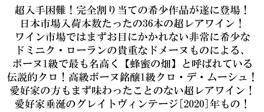 ドメーヌ・ローラン・ペール・エ・フィス元詰のボーヌ・プルミエ・クリュ・1級・クロ・デ・ムーシュの超グレイトヴィンテージ[2020]年が蔵出し品の正規品が限定で少量入荷!