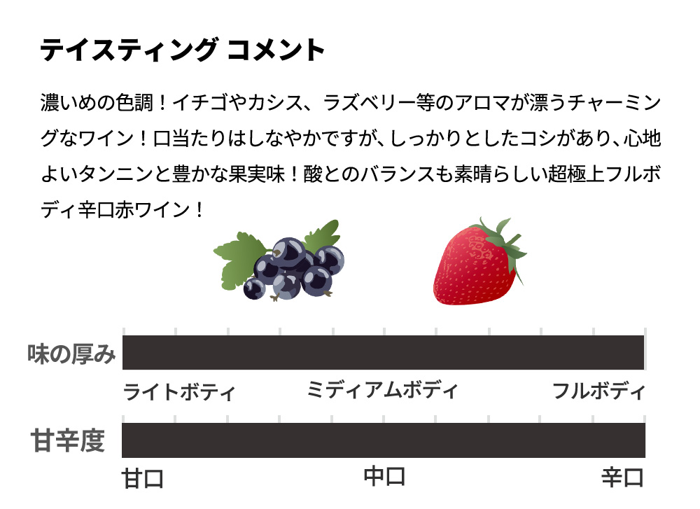 深い色合いとイチゴ、カシス、ラズベリーの香りが特徴的な逸品である。40年を超える樹齢のピノ・ノワールから、手摘みで丁寧に選ばれた果実が、フレンチオーク樽で熟成され、力強いタンニンと豊かな果実味が絶妙なバランスを醸し出す。フィサンAOC特有の濃厚さと繊細さが共存するワイン!