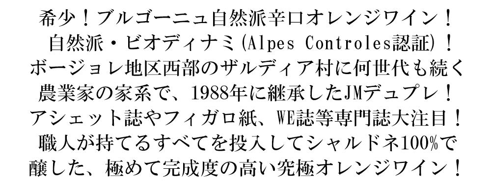希少!フランス・ブルゴーニュ自然派辛口オレンジワイン愛好家大注目!しかも自然派・ビオディナミ(Alpes Controles認証)シャルドネ100%のオレンジワイン愛好家大注目!もうすでに「Guide Hachette」、「Wine Enthusiast」、「Le Figaro」等のワインプレスも大注目!造り手のジャン・ミッシェル・デュプレ家は『ボージョレ地区西部のレ・ザルディア村に何世代も続く農業家の家系で、1988年に継承したジャン・ミッシェル・デュプレがぶどう栽培への特化を決断してドメーヌを設立しました!その後少しずつ畑の買い増しを実施し、今日、モルゴン、レニエ、ボージョレ・ヴィラージュなどに合計20ヘクタールの畑を所有しています!2014年よりその全面積でビオロジック栽培を開始し、2018年に「Alpes Controles」の認証を取得しました!「ぶどう畑一帯の生物多様性と生態系の保護を何よりも大切にしています。ここに咲くすべての花、ここに生きるすべての小動物や微生物たちと一緒にぶどうを育てています。また、放牧している羊たちも大事な仲間です」。「ワインの品質は、ぶどうの質によって決まります。ぶどうの質は、どれだけ畑仕事に精魂を込めたかによって決まります。私は畑仕事におけるいかなる手間も困難も、避けず、恐れず、真正面から取り組むことを天命と考えています。」醸造は温度変化が緩やかなコンクリート製タンクや樽を使用して、精密かつナチュラルに行っています!また近年は、SO2の使用も必要最小限に抑えています!ご紹介するこの作品は、この職人が持てるすべてを投入してシャルドネ100%で醸した、極めて完成度の高いオレンジワインです!「数年間試行錯誤した結果、40%ほど樽で熟成させると最も美味しくなることがわかりました。「ぶどう」から造られた「オレンジ」ワイン…グラスから立ち上がるのは「レモン」や「桃」の香り…オレンジワインは本当に魅惑的で楽しいワインだと思います」。収穫はすべて手摘み!原則として天然酵母のみで発酵!無清澄・ノンフィルターでビン詰め!SO2の使用は最小限 2014年よりビオロジック栽培!2018年に「Alpes Controles」の認証取得!Vin de France(オレンジワインのため。畑の格付けはAOC Beaujolais-Villages Blanc)!シャルドネ100%!1ha!砂質・花崗岩質土壌!樹齢約10年!コンクリート製タンクで15日間のマセラシオン発酵後、60%をタンクで、40%を樽でマロラクティック発酵&10ヶ月間熟成!無清澄・ノンフィルターでビン詰め!SO2の使用は最小限。作品名の「Le temps des Oranges」(オレンジの実る頃)は、シャンソンの歌曲「Le temps des Cerises」(さくらんぼの実る頃)にかけたものです。(スタジオジブリの映画「紅の豚」の劇中でジーナが歌っていた曲です)こだわりのブルゴーニュ自然派辛口オレンジワインが超限定で少量入荷!