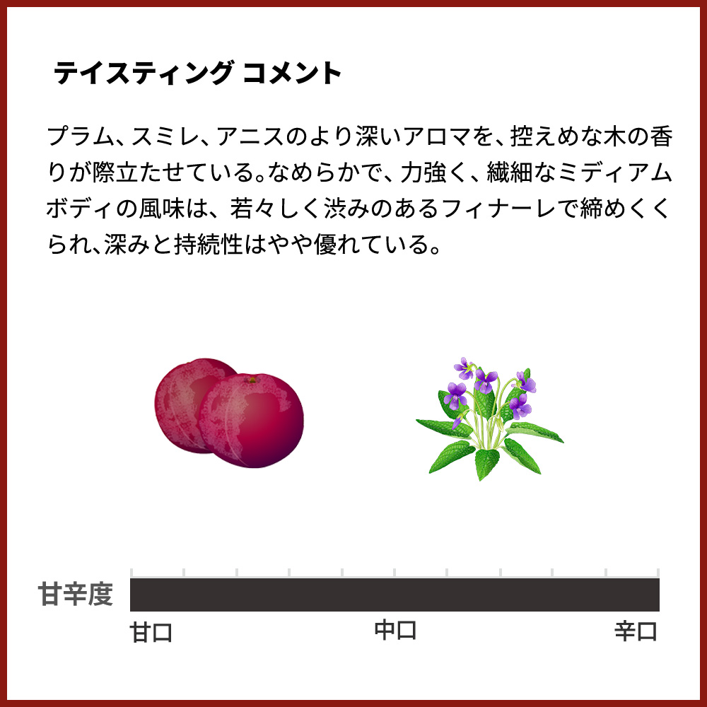 ジャスパー・モリスから90-93点、アラン・メドゥのバーガウンドから89-91点(Outstanding評価)を獲得。プラム、スミレ、アニスの深いアロマとなめらかで力強いミディアムボディの風味が特徴で、若々しい渋みのあるフィナーレが続く。赤系果実にバラの花びらのニュアンスがあり、ミネラルを思わせる風味豊かで緻密なタンニンが溶け込み、長い余韻が魅力の究極のシャンボール・ミュジニー・オー・クロワである。