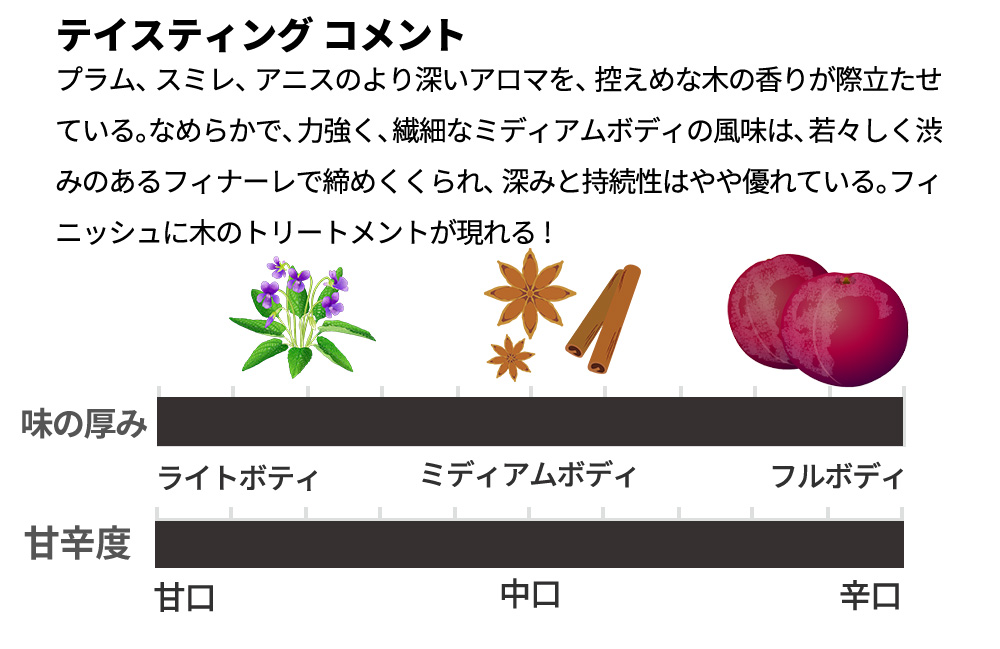 ■発酵・熟成:全房40%使用して発酵、樽で18ヶ月熟成(新樽率10%)