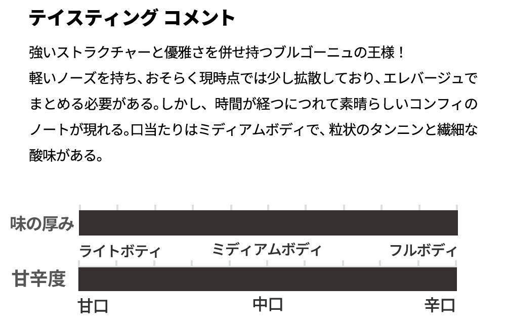 軽やかなノーズと粒状のタンニン、繊細な酸味が特徴で、エレバージュを経てさらに素晴らしい味わいが期待される。アルノーとソフィーはテロワールと果実味を最大限に表現するため、人的介入を極力抑える栽培方法を採用。このワインはブルゴーニュ・コート・ド・ニュイの赤に92点の評価を受け、ジュヴレ・シャンベルタン愛好家にとって見逃せない逸品!。