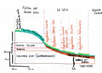 オークセイ・デュレス村に長く続くヴィニュロンの家系で、戦後1949年に、ジェラール・クルーズフォンが畑を再興してドメーヌを設立しました。1970年より、2代目アラン(写真上右)が自社ビン詰めを開始。そのワインの美味しさは口コミで評判となり、フランス国内や近隣諸国を中心に、多数のファンを獲得してきました。2001年より息子のヴァンサン(写真上左)が参画し、2015年、3代目として正式にドメーヌを継承しました。地元オークセイ・デュレス、ムルソー、モンテリー、ヴィルネイ、ポマール、ボーヌなどに合計12ヘクタールの畑を所有し、その全面積で厳格なリュット・レゾネ栽培を実践しています。「2001年にドメーヌで働き始めるにあたって、今日から畑が自宅だと思いなさい、と父に言われました。趣味も持たず畑仕事に人生を捧げ、“良いワインは良いぶどうから“を背中で示した父を尊敬しています。畑にいる父は、いつも笑顔で楽しそうでした。父の笑顔と畑。これが僕の心の原風景になっています」(ヴァンサン)。畑の申し子としての彼の魂は、最近リニューアルされたドメーヌのホームページの中でも輝いています。手書きによる、ブルゴーニュのアペラシオンと斜面、土壌の関係の説明(LE VIGNOBLE)。畑仕事ひとつひとつの写真(LA TECHNIQUE→TRABAIL DE LA VIGNE)。すべてが必要にして十分な内容にまとめられていることも、彼の知性と良心を表していると思います。お父さんとそっくりの、グローブのように分厚く大きな手。彼の思いはぶどう達にこそ伝わり、そして、その純麗な果実の味わい、土壌からたっぷりと吸い上げられたミネラルの旨味などを通じて、飲み手の心にも、確かに伝わってきます。