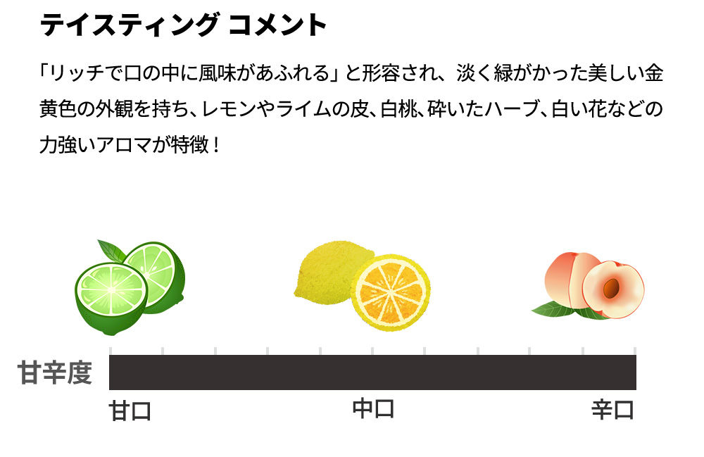このワインは「リッチで口の中に風味があふれる」と形容され、淡く緑がかった美しい金黄色の外観を持ち、レモンやライムの皮、白桃、砕いたハーブ、白い花などの力強いアロマが特徴である。