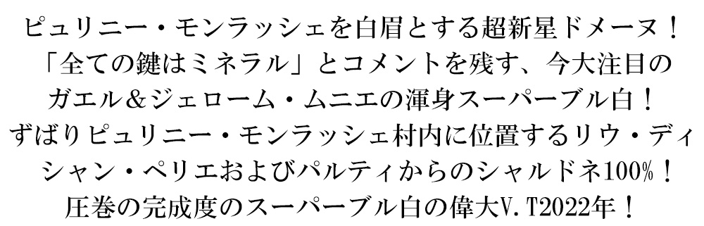 このワインは、ピュリニー・モンラッシェ村内のリウ・ディ「シャン・ペリエ」および「パルティ」から産出される高品質な辛口白ワインだ。2022年という素晴らしいヴィンテージの特徴を反映し、凝縮感とバランスに優れている。