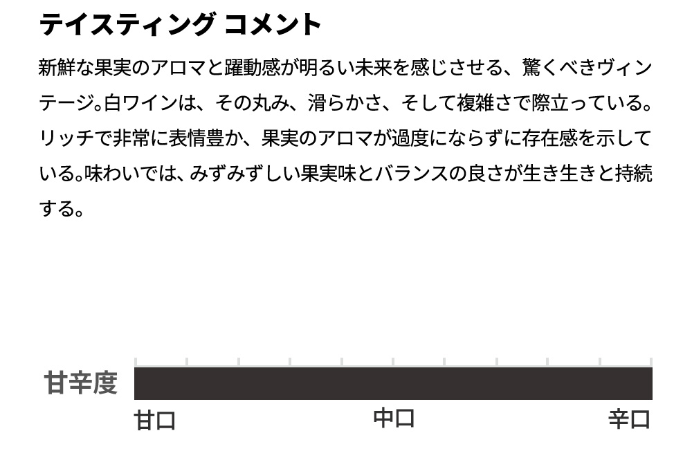 ミネラリーな味わいが際立ち、若いうちから美味しく飲めるが、熟成によってさらに深みを増す潜在能力を秘めている。口に含むと、みずみずしい果実味とバランスの良さが生き生きと持続し、奥深く長い余韻が楽しめる。