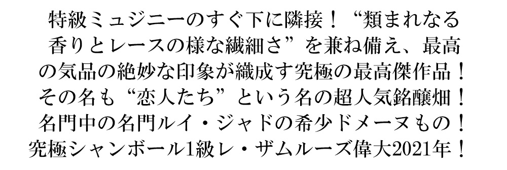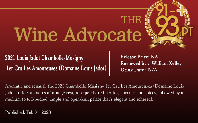 2021年のシャンボル・ミュジニー1erクリュ、レ・ザムルーズ(ドメーヌ・ルイ・ジャド)は、複雑で魅力的なアロマと味わいを持つ。