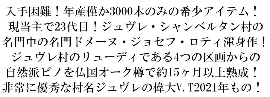 赤黒系果実を煮詰めたような凝縮感!プラム、黒糖、ミント、なめし皮やタバコの香りも感じられる!口中を覆うようなエキス分たっぷりの果実味と、スパイシーで野性的なニュアンスがあり、非常に優秀な村名ジュヴレ・シャンベルタンのグレイトヴィンテージ[2021]年ものが蔵出しで限定で極少量入荷!