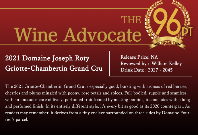 2021年ヴィンテージは特に高い評価を受けており、ワインアドヴォケイト誌で96点、ヴィノス誌で95点を獲得した。熟成ポテンシャルも高く、2027年から2045年まで楽しめると評価されている。グリオット(さくらんぼ)の風味やスパイスの洗練された香り、凝縮感とエレガンスを併せ持つ、究極のブルゴーニュ赤ワインと言える。