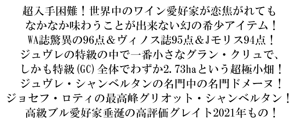 このワインは、ブルゴーニュ地方のグリオット・シャンベルタン特級畑で造られる高級赤ワインだ。100年以上の樹齢を誇るピノ・ノワールから造られ、生産量は極めて少ない。
