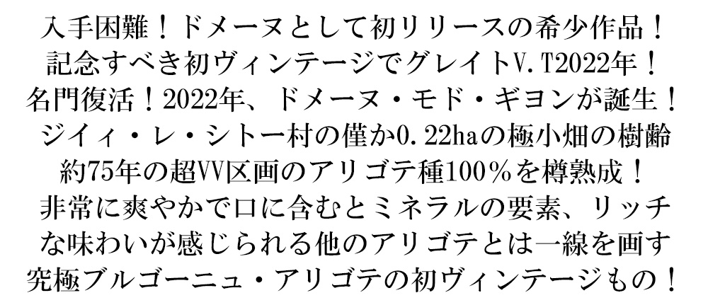 珍しい樹齢75年以上の超V.V(ヴィエイユ・ヴィーニュ)のスーパー・アリゴテ種100%!しかもドメーヌとして初リリース作品(ファーストヴィンテージ(2022年)の販売を開始したばかり。)
